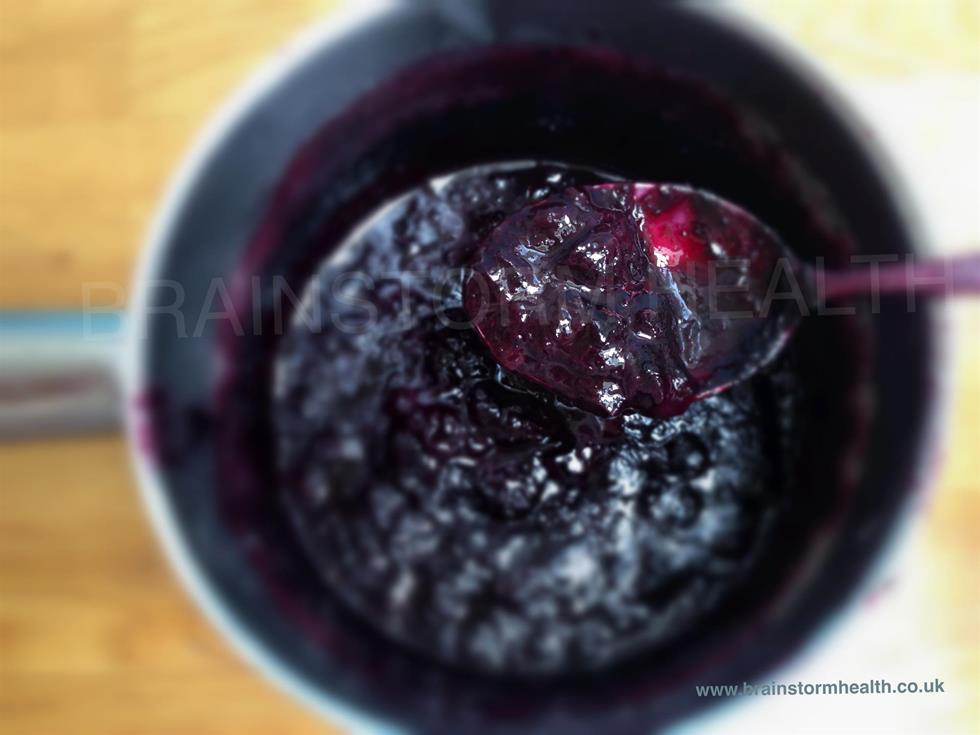 Place the blueberries in a pan without any other liquid and gently bring to the boil. Turn the heat down and simmer for about 30 minutes stirring from time to time until there is a jam like consistency
